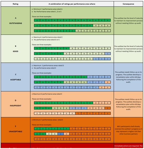 BSCI验厂分为五个等级:ABCDE,其中C\D级有限期为一年,C级比D级认可的客户更多。