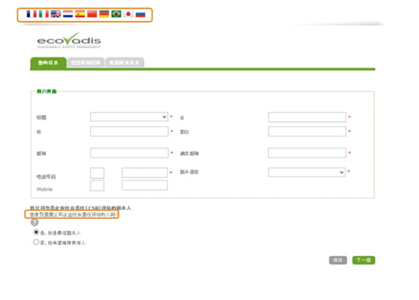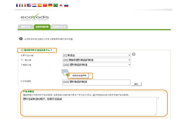 4. 填写公司主营信息,用于EcoVadis系统设置与公司相关的CSR审核调查问卷:
