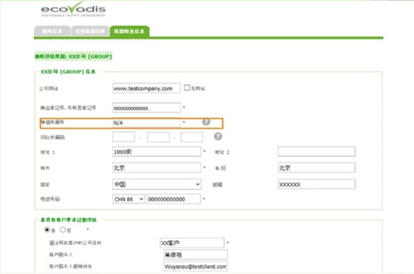 增值税编号,若没有填写N/A;邓白氏编号为选填项;若是因客户要求您进行EcoVadis评估,需标注该公司相关信息;如果您是一个子公司,需填写您母公司名称;应审核要求,需填写您公司营业额、员工人数及世界业务范围,信息将会被完全保密;点击“提交”完成注册。