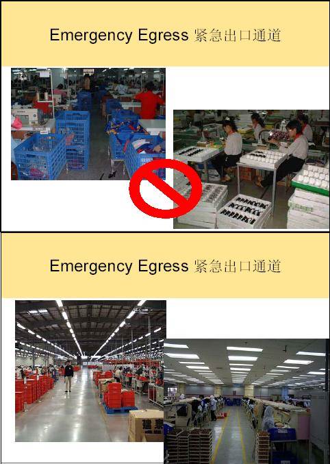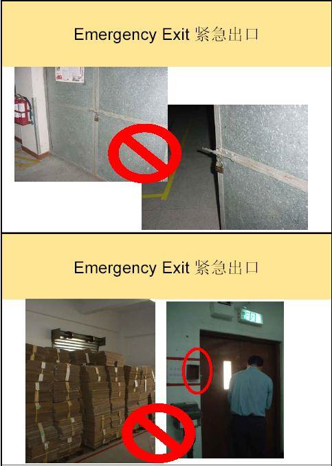 •紧急出口门上的标签是否在31米(100英寸)内能看见? •厂房及宿舍的紧急出口是否上锁? ü 紧急出口的门不能上锁,铁扣,铁链,固定螺栓和其它的上锁设备 ü 紧急出口的门能从逃生的方向轻易打开,并不需要特别的知识和技能