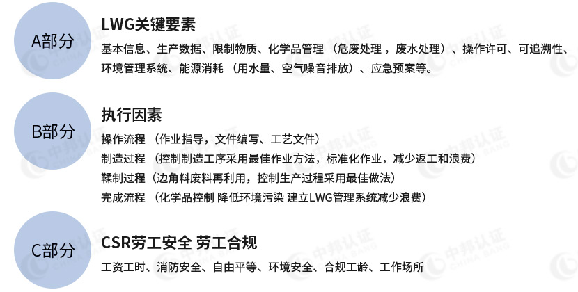 LWG认证审计标准,是英国皮革技术中心(BritishLeatherTechnologyCenter,BLC)与世界品牌鞋类采购商,或相关供货商组成并执行的认证,推行重点在〖节能、减碳、环保、管理〗的认证;目前有越来越多相关皮革跨国公司,已加入认证采购,之后皮革厂也须通过检验认证,才能取得及参与采购商的订单。