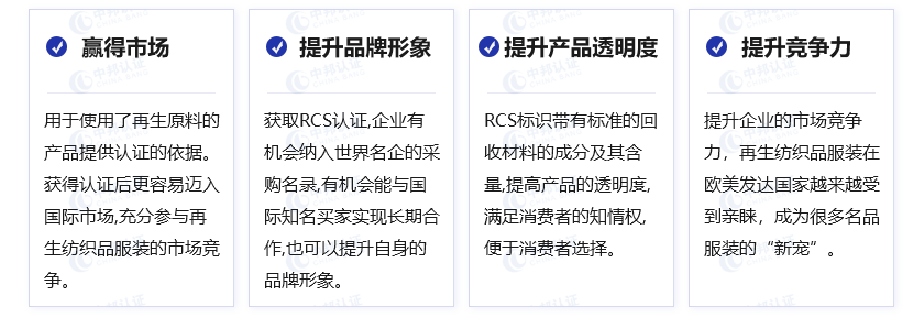 RCS回收声明标准,英文全称RecycledClaimed Standard,是TE纺织交易组织于2013年推出的另一回收(再生)方面的标准,用于使用了再生原料的产品提供认证的依据。 适用于再生原料含量在5%-100%之间的产品。认证机构有上海世优认证有限公司等几家机构,可自由选择,在TE-纺织交易组织网站可查到认证过的企业信息。 RCS认证的目的是确保产品含有回收材料。使消费者相信他们所买的产品中含有回收材料,因为他们选择了回收材料制成的产品,通过这个认证有助于增加使用再生材料,并减少废物量。RCS使用的标准为(CCS)的监管要求。就其本身而言, CCS是供应链的通用标准。此标准有助于认证过程的一致性和提高效率。一旦一个公司已被认证符合CCS的标准要求,其他的供应链要求都是在CCS基础上,减少重复认证。