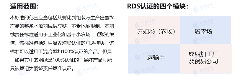 RDS负责任羽绒标准是由一直致力于服装和纺织品可持续发展的全球非盈利组织---纺织品交易所(TextileExchange)所主导,旨在用于纪录动物福利信息和确保羽绒制品可追踪性的标准。RDS认证的目的是出于对动物的人道主义保护为出发点,使动物免受虐待;使禽类在下行供应链中受到人道主义待遇,这是通过提供业界最佳工具和最佳方法完成的,以确保羽毛来自非必要伤害动物之身。且建立一个可追溯的系统,来验证羽绒材料的来源符合RDS标准要求。RDS标准认证的范围适用于从孵化到生产出来的最终产品的整条禽类供应链,并不受地域限制,适用于小农场毛贩的渠道。该标准还包括对种禽养殖模块的认证,混合型和100%认证的产品。独立的第三方审计适用于整条供应链,包括羽绒加工厂,最终产品的织造商和所有的交易者,但不要求对零售商进行认证。
